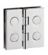 Charnière double ouverture à 180° pour porte de vitrine en verre. Montage verre sur verre. Matière laiton massif finition chromé brillant, laiton poli et chrome mat. Dimensions : hauteur 60 mm, largeur 60 mm. Pour verre d'épaisseur 6 à 8 mm. Ouverture à 180°. Pour le montage de cette double charnière, il est nécessaire de prévoir des trous sur le verre. Capacité de charge 15 Kg par paire.