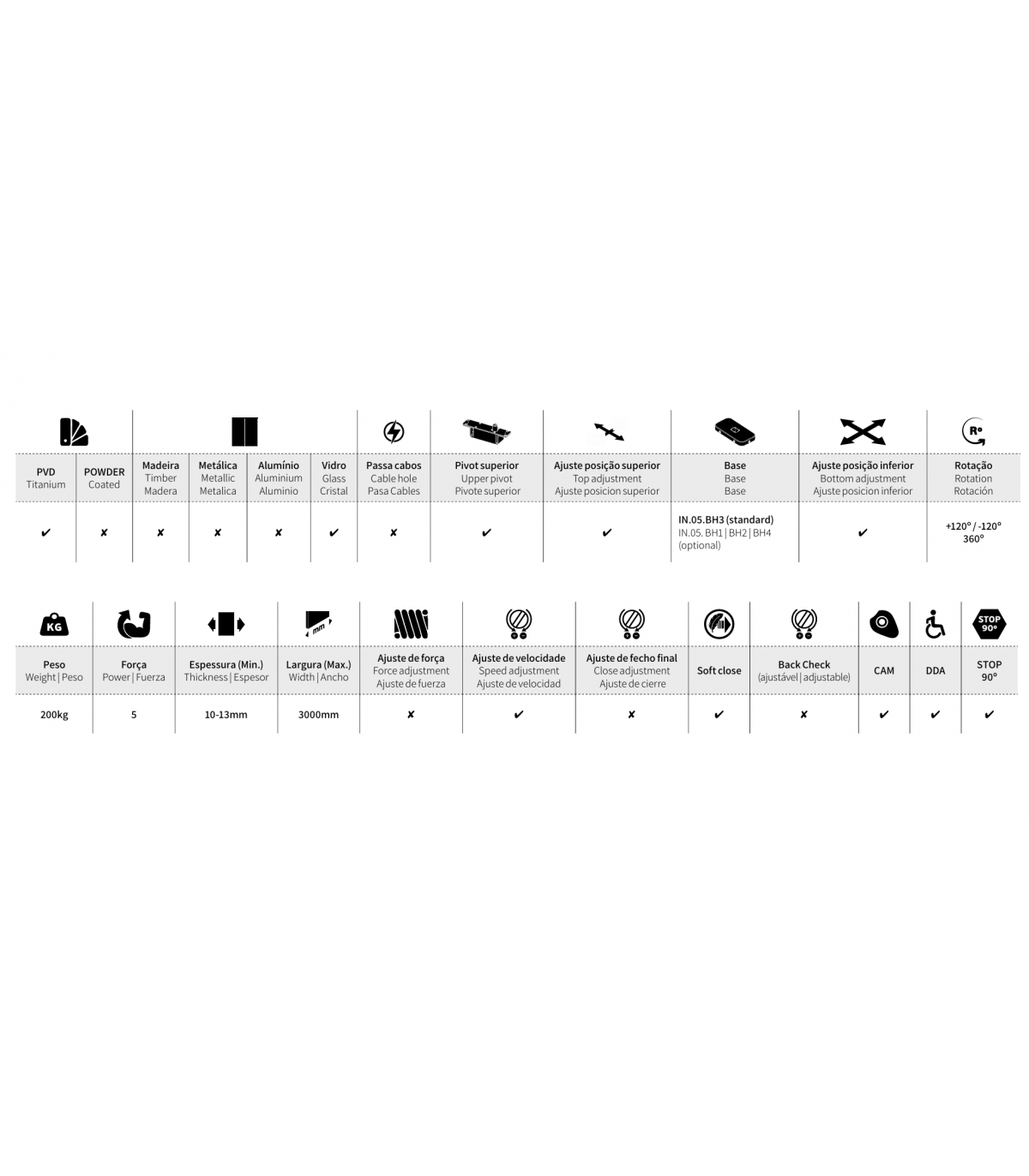 ROTATION COMPLÈTE, INSTALLATION FLEXIBLE W360 GLASS est un système de pivot hydraulique avec une rotation continue à 360°, conçu pour des portes en verre trempé jusqu'à 15 mm d'épaisseur et pesant jusqu'à 200 kg.