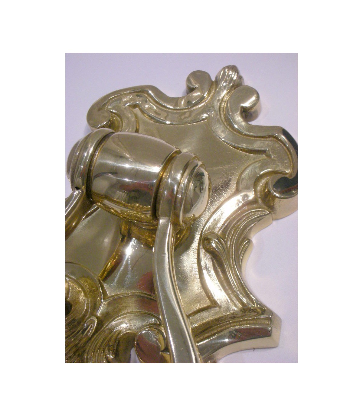 Heurtoir marteau de porte d'entrée série Lux. Réalisé en Laiton massif poli brillant et verni. Dimensions : Hauteur 220 mm - Largeur 140 mm. Pour la fixation traversante de ce heurtoir, la visserie est fournie.