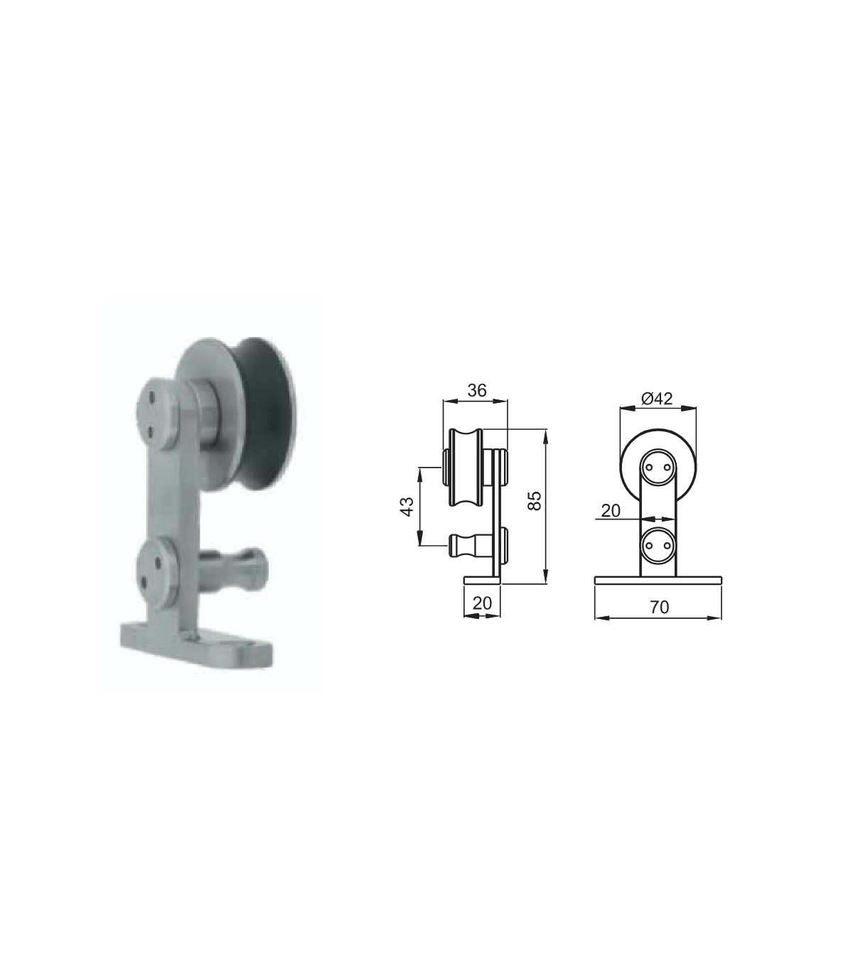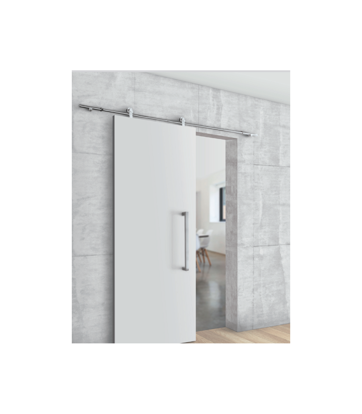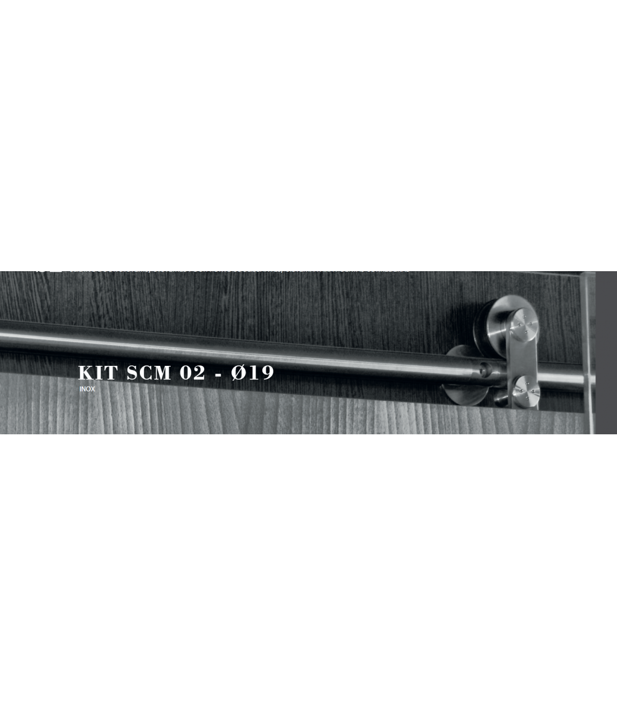Kit complet série SCM02 pour porte coulissante en bois d'épaisseur 25 à 50mm. Matière inox 304 finition brossé. Fixation par 3 points sur le mur d'une barre ronde en inox diamètre 19 mm pour une longueur de 2 mètres (2 tubes de 1 mètre). Le poids maximum de la porte installée sur cet ensemble est de 40 kg.