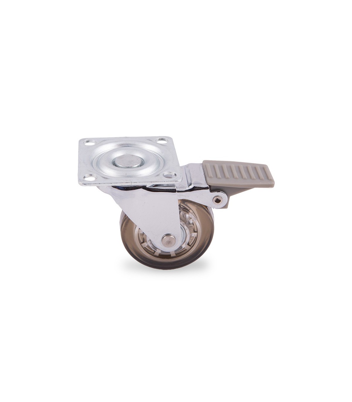 Roulette pivotante en polyuréthane (PU) transparent et couleur orange, vert, bleu et noir. Roulette avec ou sans frein disponible en diamètre 35, 50 et 75 mm.