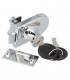 Serrure forme demi ronde pour porte simple de vitrine en verre d'épaisseur maximum 6 mm. Serrure disponible en finition chromé brillant ou doré brillant. Montage sur le verre sans trous ni encoches.