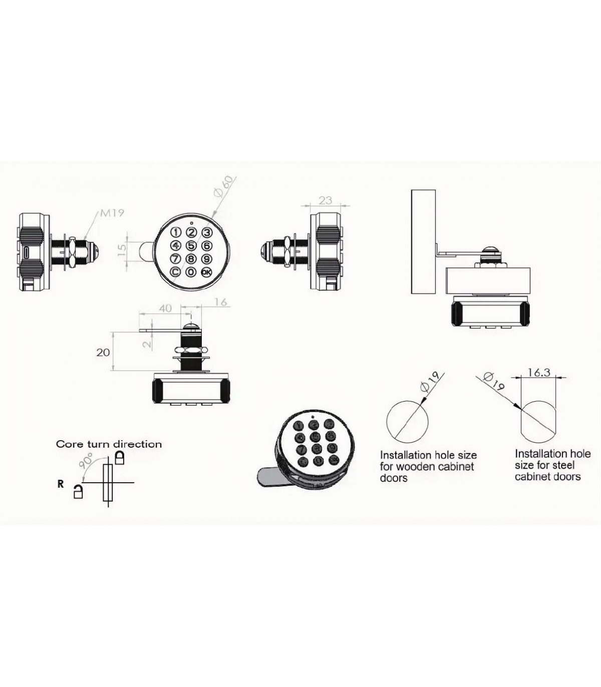 Serrure à came à clavier électrique diamètre 60mm série PHIL ouverture avec code boutons pression.