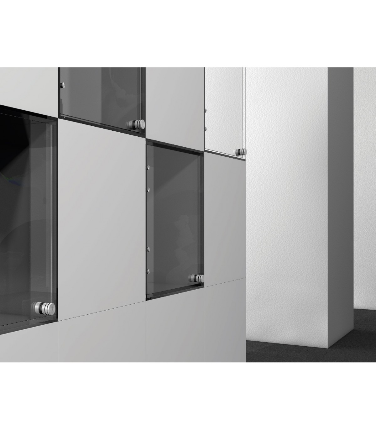 Diamètre de perçage à prévoir sur le verre : selon encoche CG64. Barillet amovible. Corps en zamak argent mat, dimensions : diamètre 30 mm, le corps de la serrure fait office de poignée pour une ouverture plus aisée de la porte.